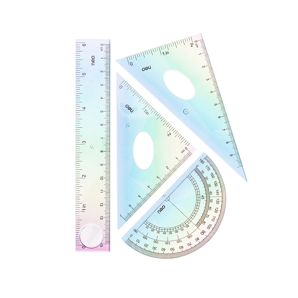 Набор линеек для черчения Deli. В наборе: линейка 15см., 2 треугольника, транспортир. Изготовлен из высококачественного, плотного и прочного полистирола. Нанесенная четкая разметка под воздействием ультрафтолетовых лучей - позволяет не только производить точные измерения, но и делает ее устойчивой к царапинам. Для удобства на линейку нанесена разметка как в сантиметрах, так и в дюймах. Дизайн легкого захвата позволяет быстро взять линейки со стола - кромки линейки на нижней стороне имеют скос, поэтому при нажатии на кромку она опускается, а все изделие приподнимается над столом. Это и есть дизайн для легкого захвата.Незаменимый атрибут школьника.