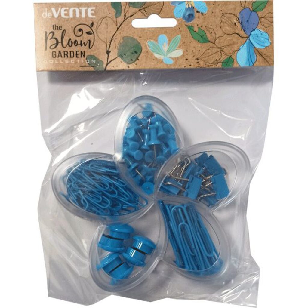 Набор канцелярских принадлежностей "deVENTE. Bloom Garden" (магниты цветные 20 мм – 6 шт, скрепки цветные 50 мм – 20 шт, скрепки цветные 28 мм – 40 шт, кнопки силовые цветные – 30 шт, зажимы для бумаг цветные 15 мм – 10 шт) голубой, в пластиковой коробке