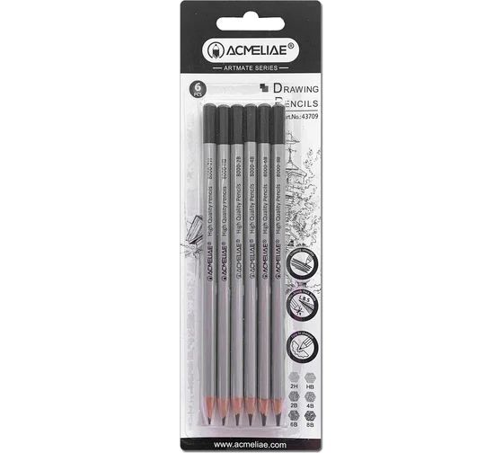 Набор карандашей для черчения твердо-мягких в 6 твердостях и разных толщинах грифеля: 2H-2мм,HB-2,2мм,2B-2,43мм,4B-2,43мм,6B-3,13мм,8B-3,5мм. Высокое качество рисования, эскизов, набросков, скетчей, чертежей любой сложности. Профессиональный проклейка грифеля предотвращает его поломки при падении и затачивании. Однородный грифель карандаша не царапает бумагу, оставляет четкие яркие линии, не крошится, затачивается до нужной остроты. Шестигранный корпус легкий, удобно лежит в руке, пальцы не скользят – можно работать без усталости. Корпус из высококачественной древесины ровно и аккуратно затачивается стандартными точилками, не меняет цвет, упругость, не трескается. Длина корпуса 175мм. Матовая бархатистая лакированная поверхность, серебристый корпус, запаянный верх. Заточенные. Художественные профессиональные карандаши подойдут для студентов вузов, инженеров, художников, архитекторов, чертежников, дизайнеров, художественных студий, школ, колледжей, школьников.