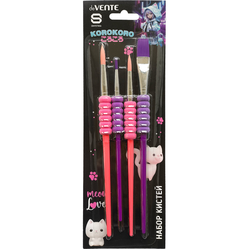 Набор кистей "deVENTE. Korokoro" 4 шт (синтетика круглые № 2, 6, 10, плоская № 12) ручка с эргономичным грипом Soft Touch, окрас волоса, ручки и грипа в ярких желтом и розовом цветах, в картонном блистере