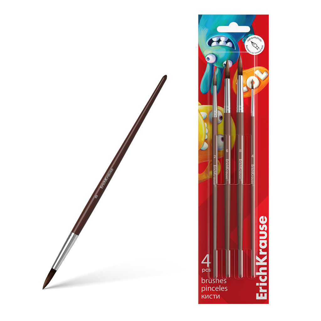 Кисти ErichKrause для рисования акварельными красками и гуашью. Рабочая часть кисти покрыта гуммирующим составом, защищающим ее при хранении и транспортировке. Ручка изготовлена из натурального дерева и покрыта защитным лаком. Цельнометаллическая бесшовная обойма из алюминия устойчива к коррозии. Круглые 2, 4, 6, 8