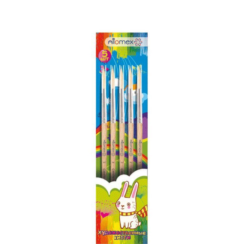 Набор кистей "Attomex" 05 шт (синтетика 1, 2, 3, 4, 5) деревянная ручка, в пластиковом блистере
