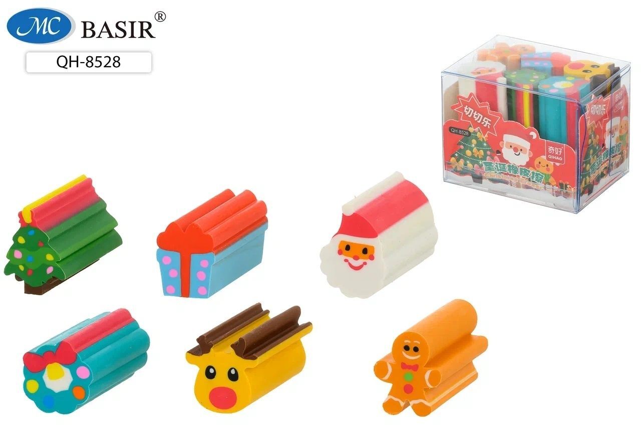 Ластик: "НОВОГОДНИЕ"; мягкий, фигурный-цилиндрической формы, цветные, в пластиковой упаковке по 6 штук, размер 6,5*5,0*5,0 см.