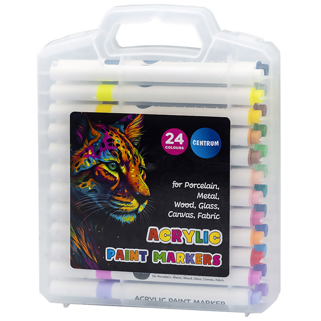 Набор акриловых маркеров Centrum. Это отличная альтернатива для любителей акриловых красок. Применение их востребовано в творческой деятельности, как правило, это различные виды декоративных техник. Маркеры используются на любых поверхностях, благодаря чему помимо рисунков и целых композиций на бумаге и холсте, удобны в создании граффити и росписи стекла, ткани, дерева, керамики. Цвета легко смешиваются между собой, благодаря чему можно получать всевозможные цветовые переходы. Чернила не размываются водой, после высыхания приобретают насыщенную пленочную поверхность. Маркеры представлены в круглом пластиковом корпусе с плотно прилегающими колпачками. Наконечник в форме кисти позволяет формировать мазки, создавать линии различной толщины, детально прорабатывать мелкие детали изображения. Палитра из 24 цветов открывает простор для творчества. Разнообразие оттенков позволяет добиваться более реалистичных рисунков, тем самым, достигая новых высот в работе.