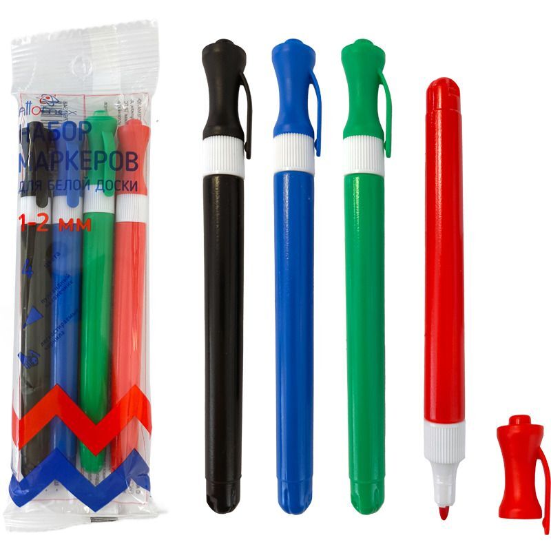 Набор маркеров для белой доски "Attomex. Ergonomy" (04 цв - зел, красн, син, черн) круглый корпус, эргономичный колпачок для снятия одной рукой, с клипом, тонкий пулевидный наконечник, ширина линии 2 мм, в пластиковом пакете с подвесом