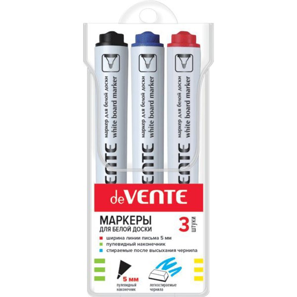 Набор маркеров для белой доски "deVENTE" (03 цв - красн, син, черн) круглый корпус с клипом, пулевидный наконечник, ширина линии 5 мм, в пластиковом блистере