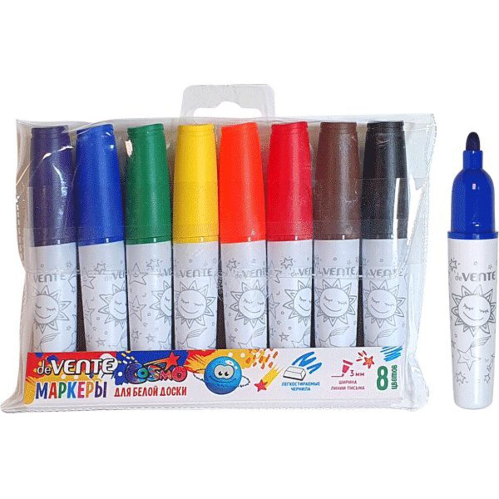 Набор маркеров для белой доски "deVENTE" (08 цв - зел, красн, син, черн, оранж, жёлт, гол, фиол) круглый корпус с клипом, пулевидный наконечник, ширина линии 5 мм, в пластиковом блистере