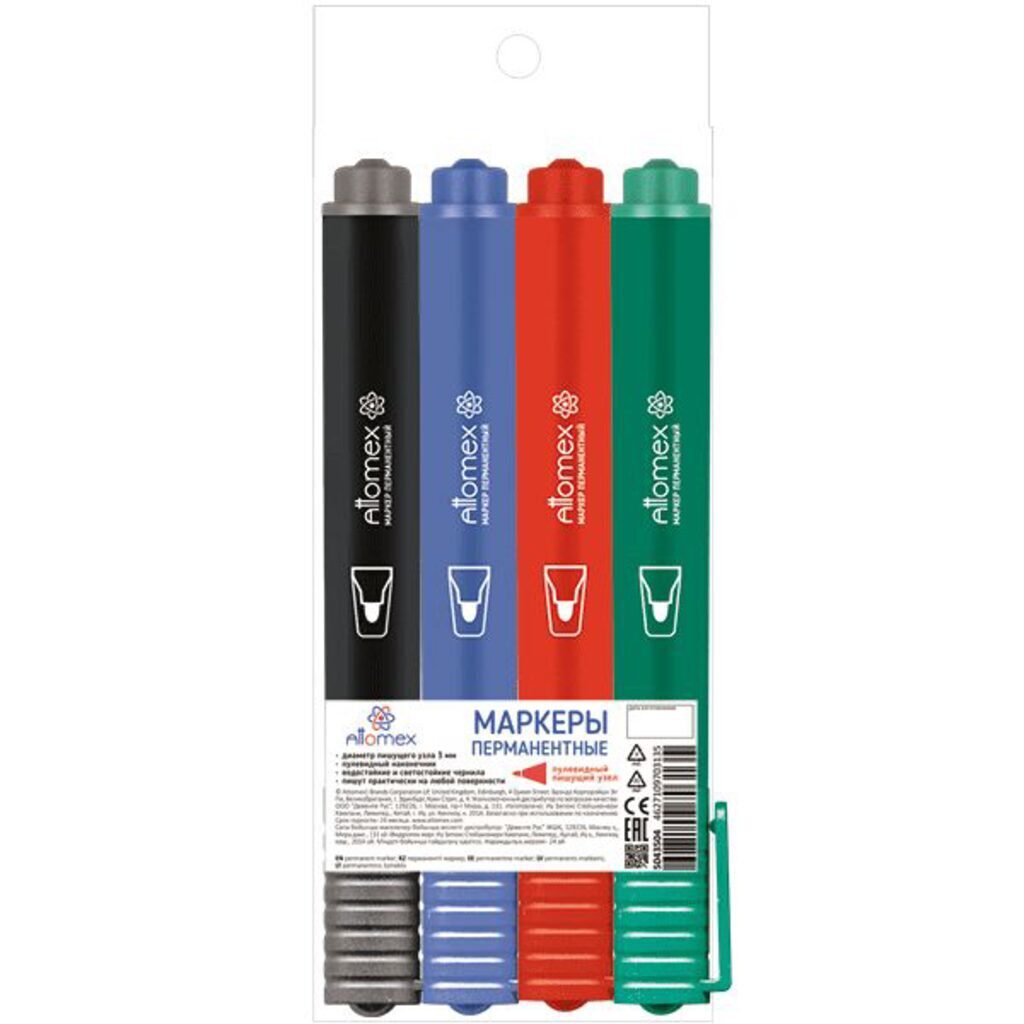 Набор маркеров перманентных "Attomex" (04 шт - зел., красн., син., черн.) круглый корпус, пулевидный наконечник, ширина линии 3 мм, в пластиковом блистере.