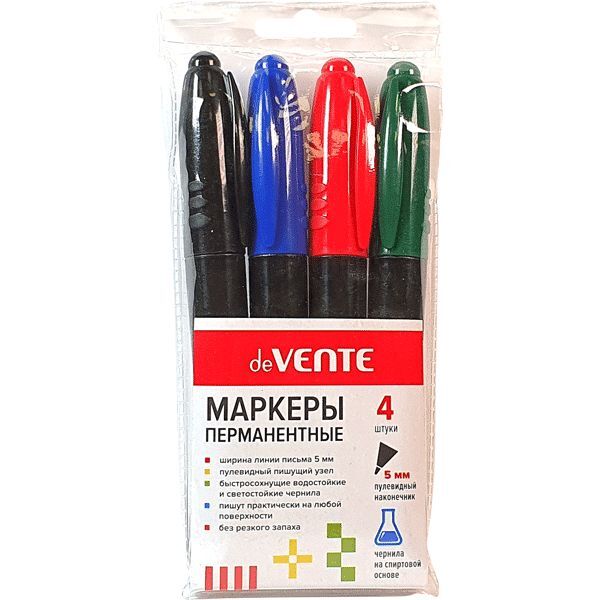 Набор маркеров перманентных "deVENTE" (04 шт - зел., красн., син., черн.) круглый корпус с клипом, ширина линии 5 мм, в пластиковом блистере