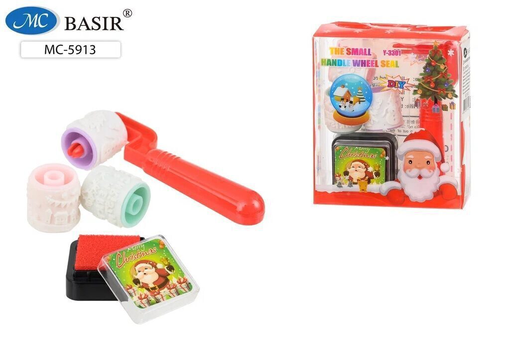 Набор подарочный канцелярский: детский "НОВОГОДНИЙ"; ролик-штамп фигурный 3 шт+штемпельная подушка, пластиковая упаковка/9*8 см