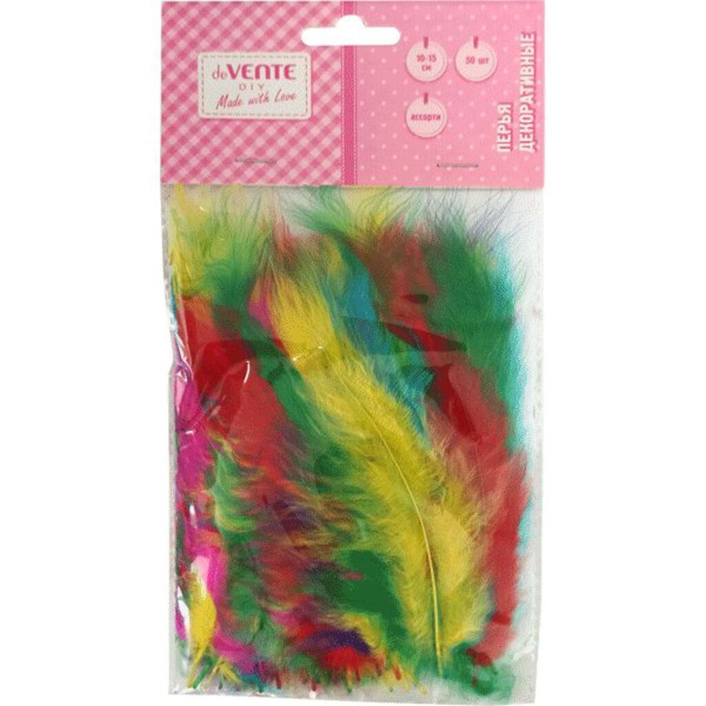 Перья декоративные "deVENTE. Пестрый микс" натуральные индюшиные, размер 10-15 см, 50 шт ассорти цветов, в пластиковом пакете с блистерным подвесом