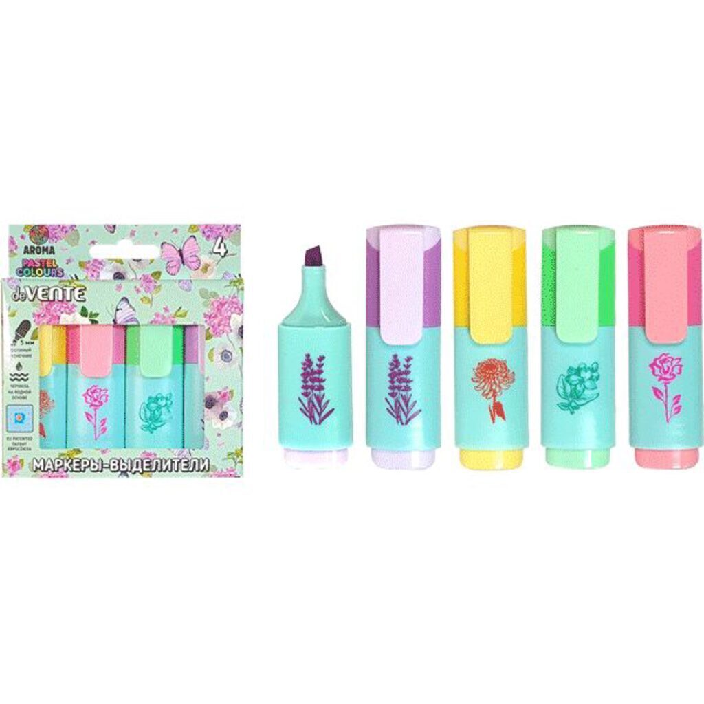 Набор маркеров-выделителей "deVENTE. Flowers" (04 цв - пастельные цвета: роз, желт, зелен, фиол) плоский мини-корпус, скошенный наконечник, ширина линии 1-5 мм, ароматизированные чернила, в картонной коробке