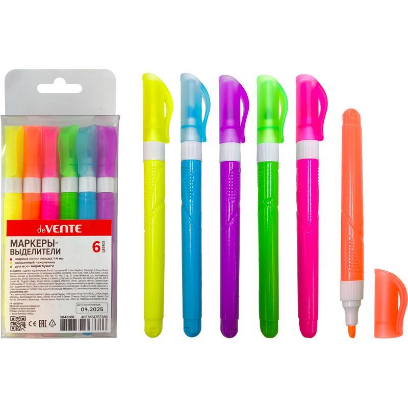 Набор маркеров-выделителей "deVENTE. Sirius" (06 цв - желт, зел, оранж, роз, сирен, голуб) круглый корпус, колпачок с клипом, скошенный наконечник, ширина линии 1-4 мм, в ПВХ коробке с европодвесом