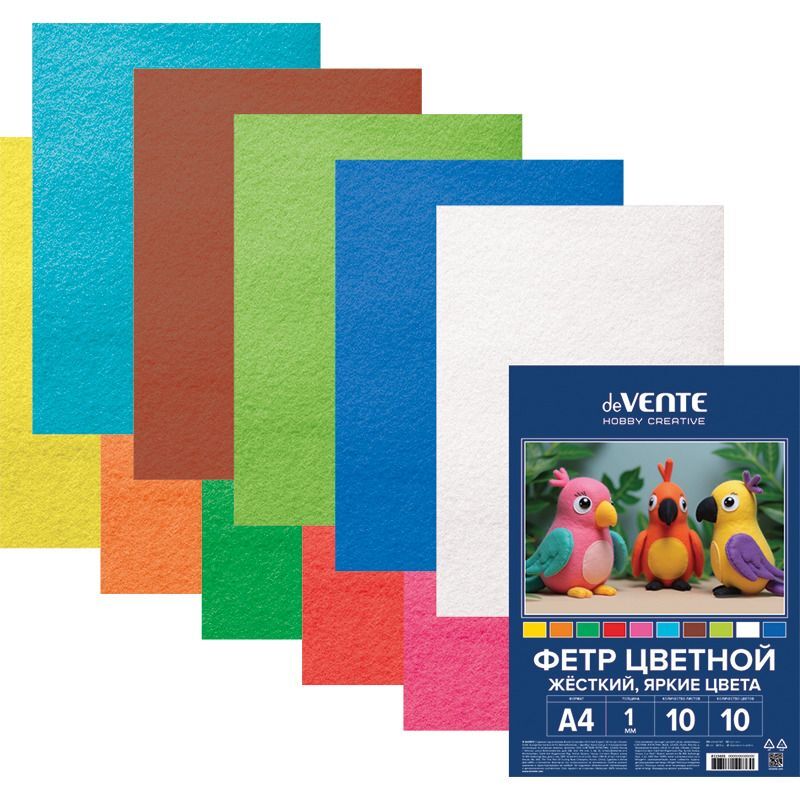 Фетр цветной жесткий A4 "deVENTE. HOBBY CREATIVE. Яркие цвета" 10 цв, 10 л, толщина 1 мм, пластиковый пакет с европодвесом