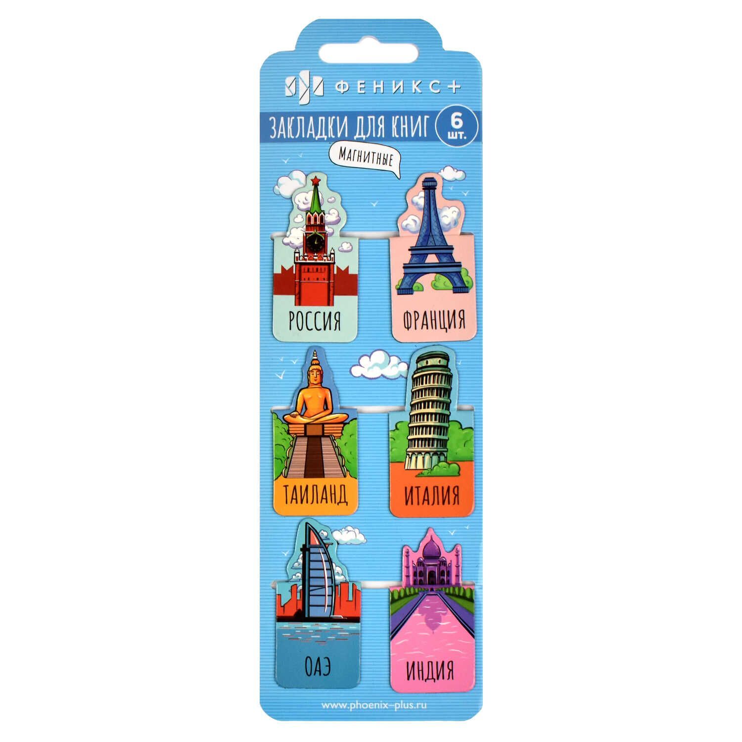 Набор закладок магнитных для книг, СТРАНЫ МИРА. Размер: 27x52 мм. Комплектность: 6 шт. в наборе. Материал: мелованная бумага, ферроагломерированный полимер. Цвет - голубой, желтый, зелёный, красный, оранжевый, розовый, серый, синий. Отделка: полноцветный дизайн. Особенности: глянцевая ламинация. подложка с европодвесом из мелованного картона + ПЭТ-пакет.
