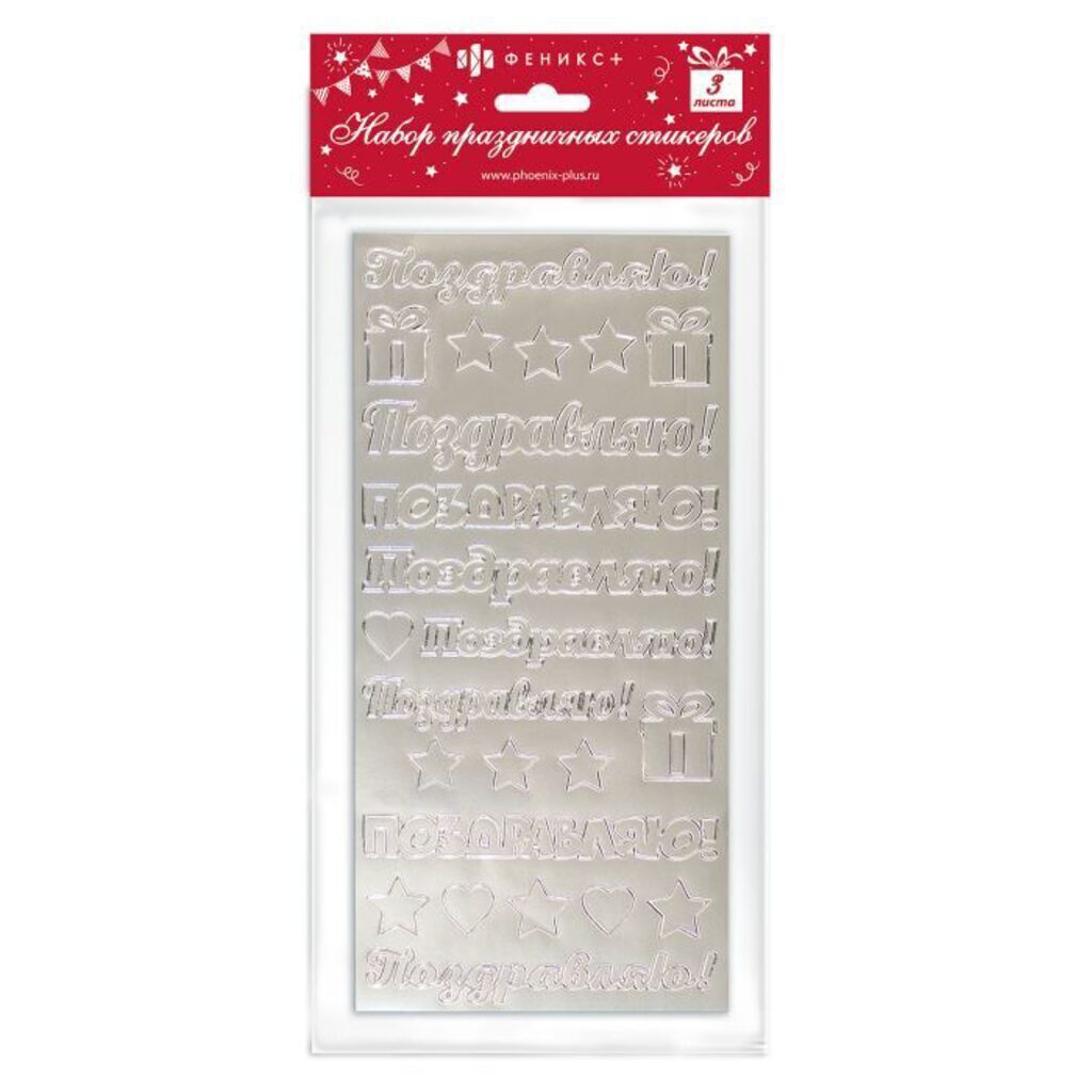 Набор самоклеящихся праздничных наклеек арт.48056/96 ПОЗДРАВИТЕЛЬНЫЕ СЕРЕБРО (109x230, из бумаги на бумажной подложке, 10шт наклеек на листе, в наборе 3 листа, тиснение фольгой, шелкография, пэт пакет)