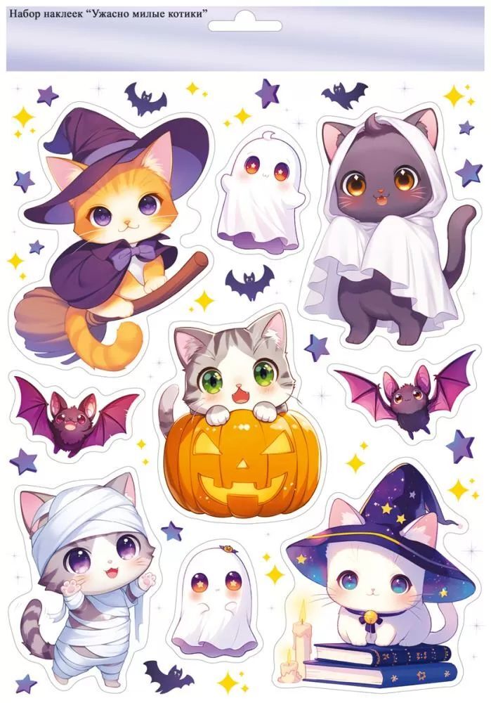 Оформительские наклейки подходит для любых гладких поверхностей: дерево, стекло, металл, пластик, кафель, обои (кроме бумажных). Не оставляет следов. Наклейки двусторонние, многоразовые. Интерьерные наклейки украсят помещение и создадут праздничное настроение на Хэллоуин. "Ужасно милые котики". Размер листа: 23,2х33,2 см на листе 17 наклеек. Размер наклеек: Котик: 9х13см, 8х11,5см, 8х10см, 6х10см, 11х11см, Привидение: 4х6см, 4х5см, Летучая мышь: 6х3см 7х3,5см.