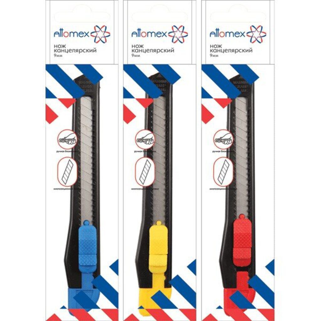 Нож канцелярский "Attomex" с шириной лезвия 9мм. Имеет пластиковые направляющие, ручную блокировку лезвия. Упакован в пластиковый блистер, цвета ассорти.