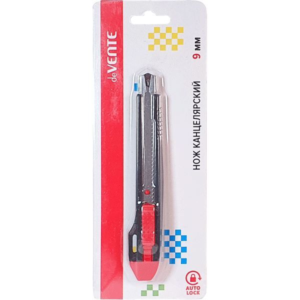 Нож канцелярский "deVENTE" 09 мм, металлические направляющие, автоматическая блокировка лезвия, картонный блистер, черный с красным