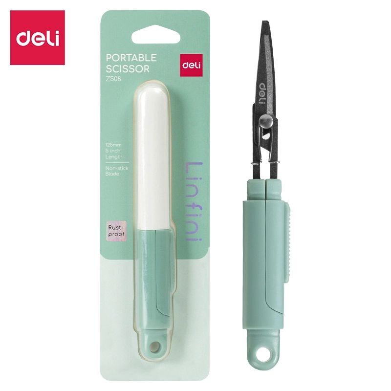 Портативные ножницы Deli EZ508, длина 125 мм, лезвия с антипригарным покрытием, защитный колпачок, цвет синий