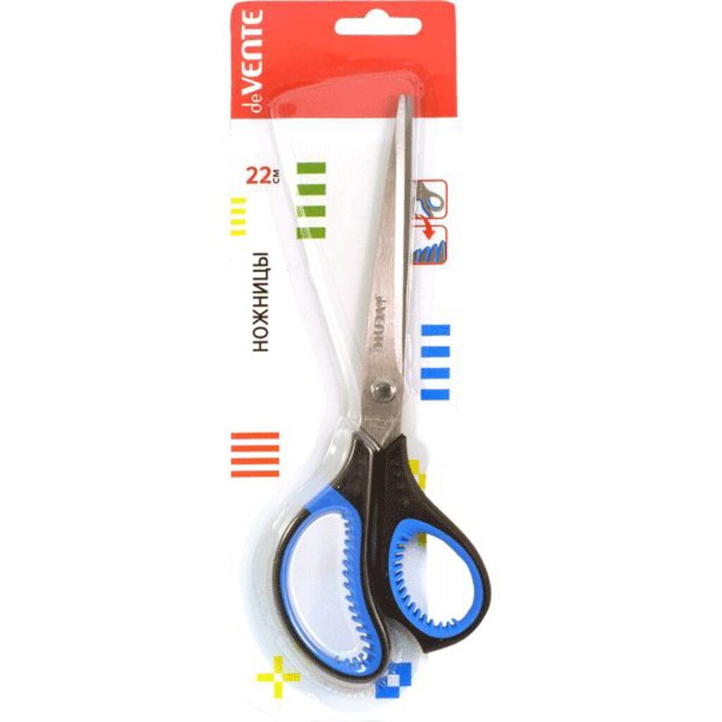Ножницы канцелярские "deVENTE. Gills" 22 см, двухцветные прорезиненные кольца c лепестками, в картонном блистере.Нержавеющая сталь двойной шлифовки 2 мм, материал ручек пластик и каучук,асимметричные кольца. Длина лезвия: 10,5 см