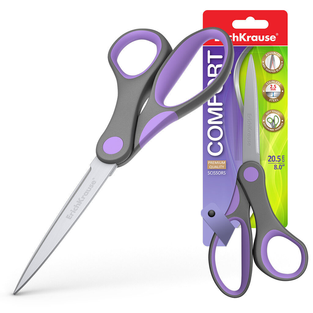 Ножницы канцелярские EK "Comfort" 20,5 см. с лезвиями из высококачественной нержавеющей стали с улучшенной двойной заточкой, повышающую легкость резки при максимальном количестве листов. Не ржавеют. Ручки эргономичной формы из ударопрочного пластика с противоскользящими резиновыми вставками.