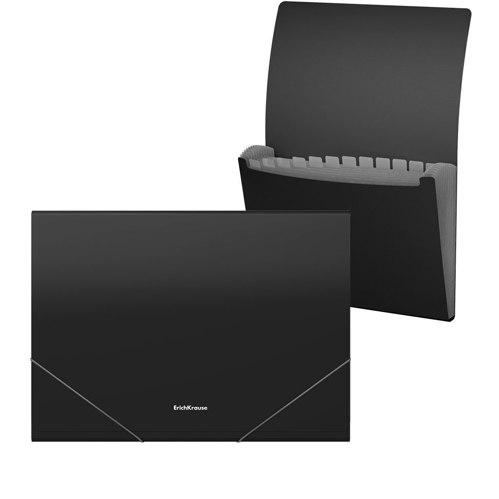 Папка-картотека с 12 отделениями формата А4 из высококачественного пластика с текстурой поверхности "песок", на которой не видно отпечатков пальцев и мелких царапин. Предназначена для хранения, систематизации и транспортировки документов. Цвет папки - черный. Эластичные резинки надежно удерживают папку в закрытом состоянии. Размер - 330х240х25мм, толщина - 0.6мм.