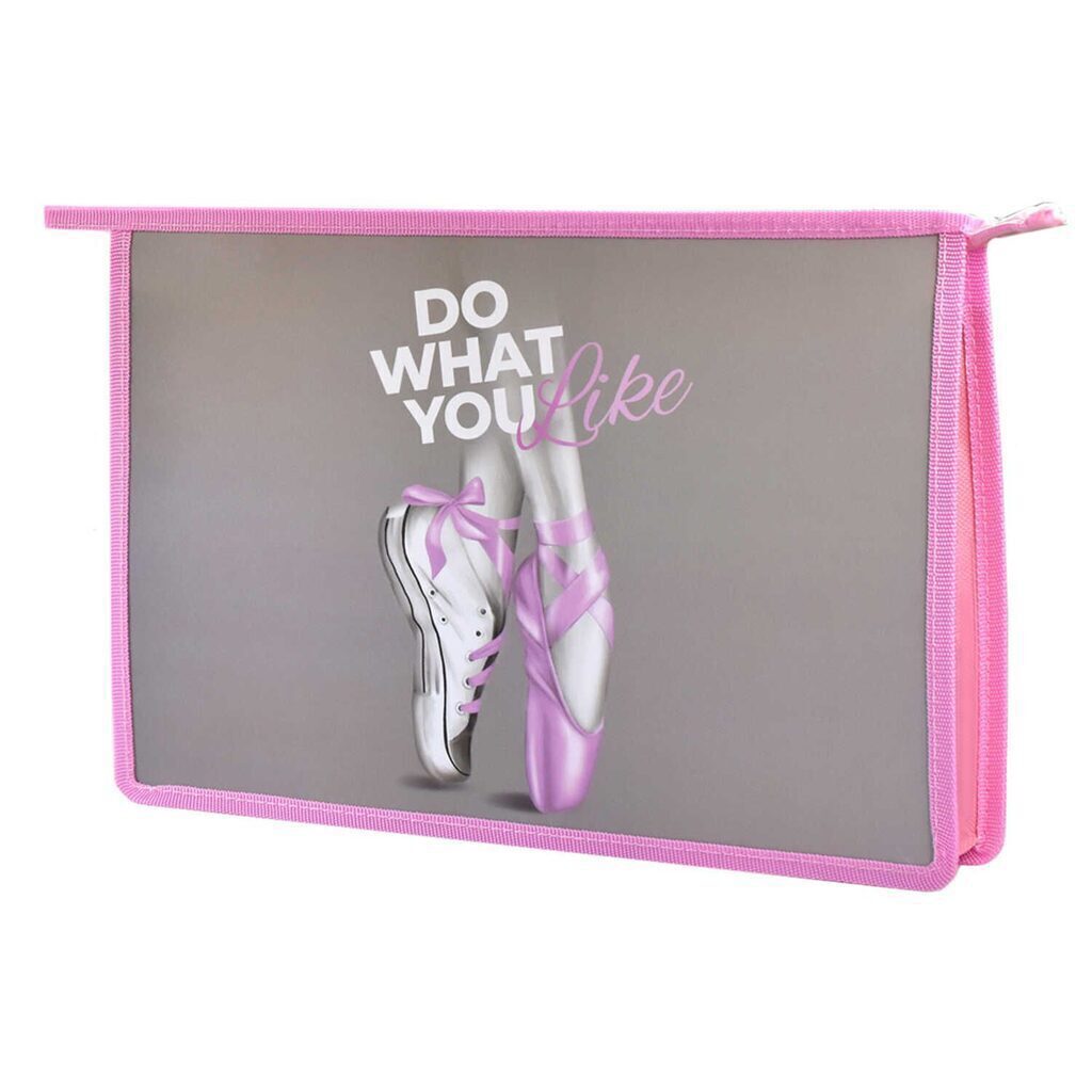 Папка для школьных тетрадей. БУДЬ РАЗНОЙ. Формат А4. Размер: 33х23х7 см. Материал: полипропилен. Толщина: 500 мкм. Количество отделений: 1. Тип застёжки: молния. Цвет - серый+розовый. Отделка: УФ-печать, полноцветный дизайн. Особенности: дно с расширением.