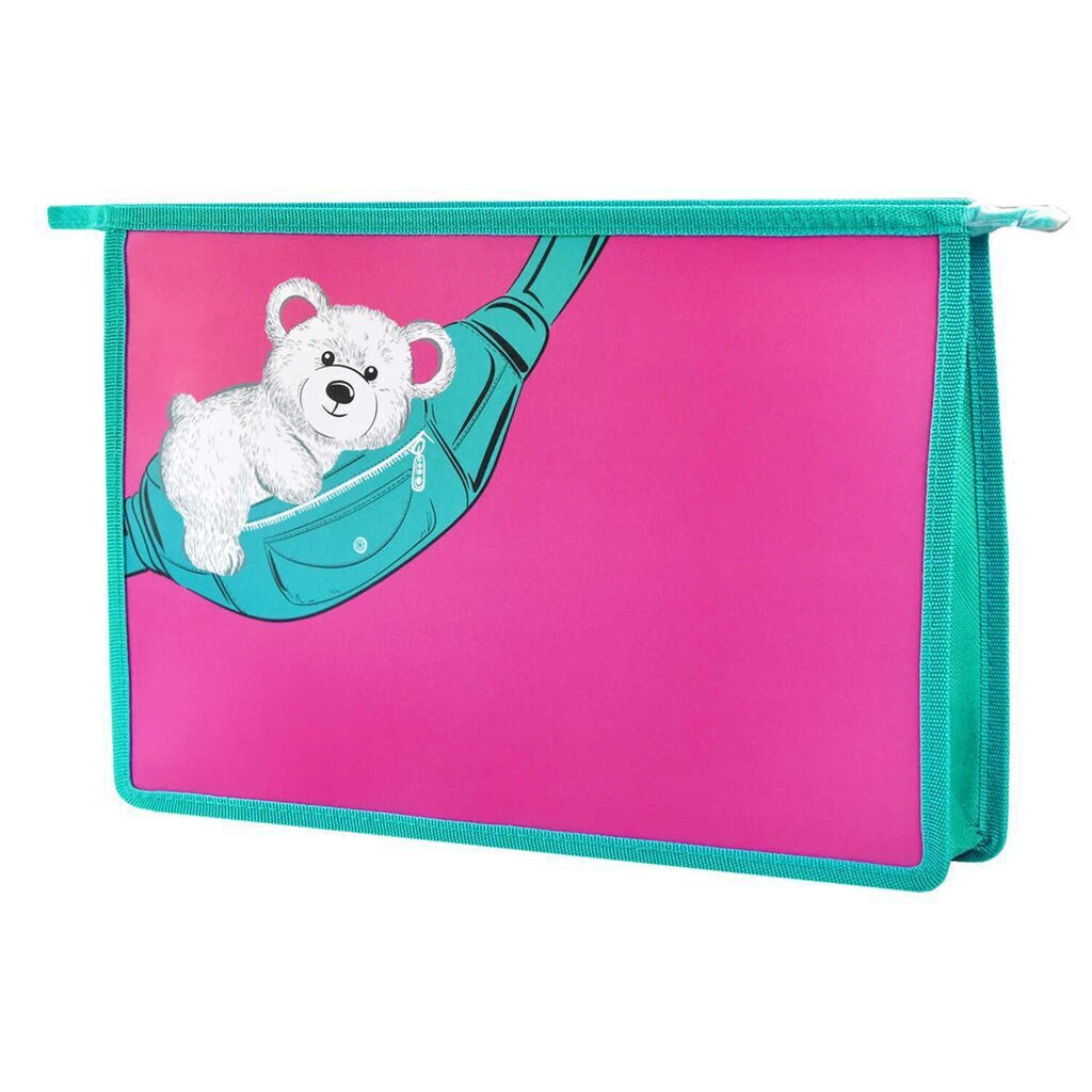 Папка для школьных тетрадей. МИШКА НА СУМКЕ. Формат А4. Размер: 33х23х7 см. Материал: полипропилен. Толщина: 500 мкм. Количество отделений: 1. Тип застёжки: молния. Цвет - розовый+бирюзовый. Отделка: УФ-печать, полноцветный дизайн. Особенности: дно с расширением.