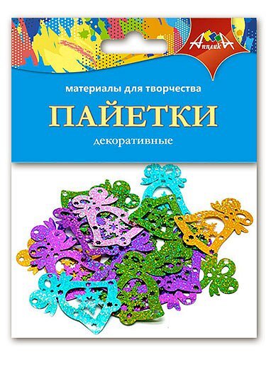 Набор для творчества. Декоративные пайетки из металлизированого пластика. В серии: пайетки новогодней тематики: разноцветные снежинки диаметром 20 мм, разноцветные елочки высотой 20 мм, голографические елочки высотой 45 мм, голографические колокольчики высотой 80 мм. Упаковка - ПЭТ пакет с картонным европодвесом.