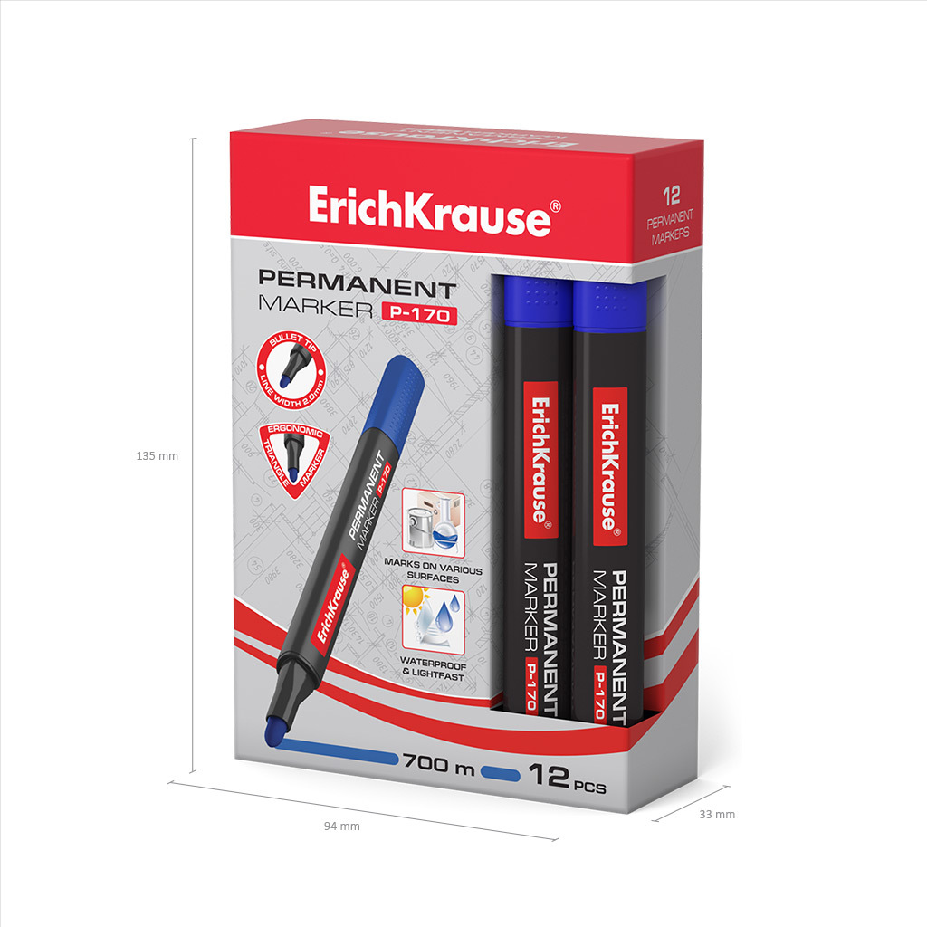 Перманентный маркер с наконечником пулевидной формы. Предназначен для письма и маркировки практически на всех поверхностях: бумага, картон, стекло, пластик, фарфор, дерево и др. Имеет эргономичную трехгранную форму корпуса и цветной колпачок. Цвет колпачка соответствует цвету чернил. Наконечник устойчив к повреждению и истиранию.Толщина письма - 2.0 мм. Чернила на спиртовой основе, водостойкие, светостойкие, устойчивые к ультрафиолетовым лучам, быстро высыхают после нанесения. Не токсичны. Не содержат ксилол, толуол. Срок годности 5 лет.