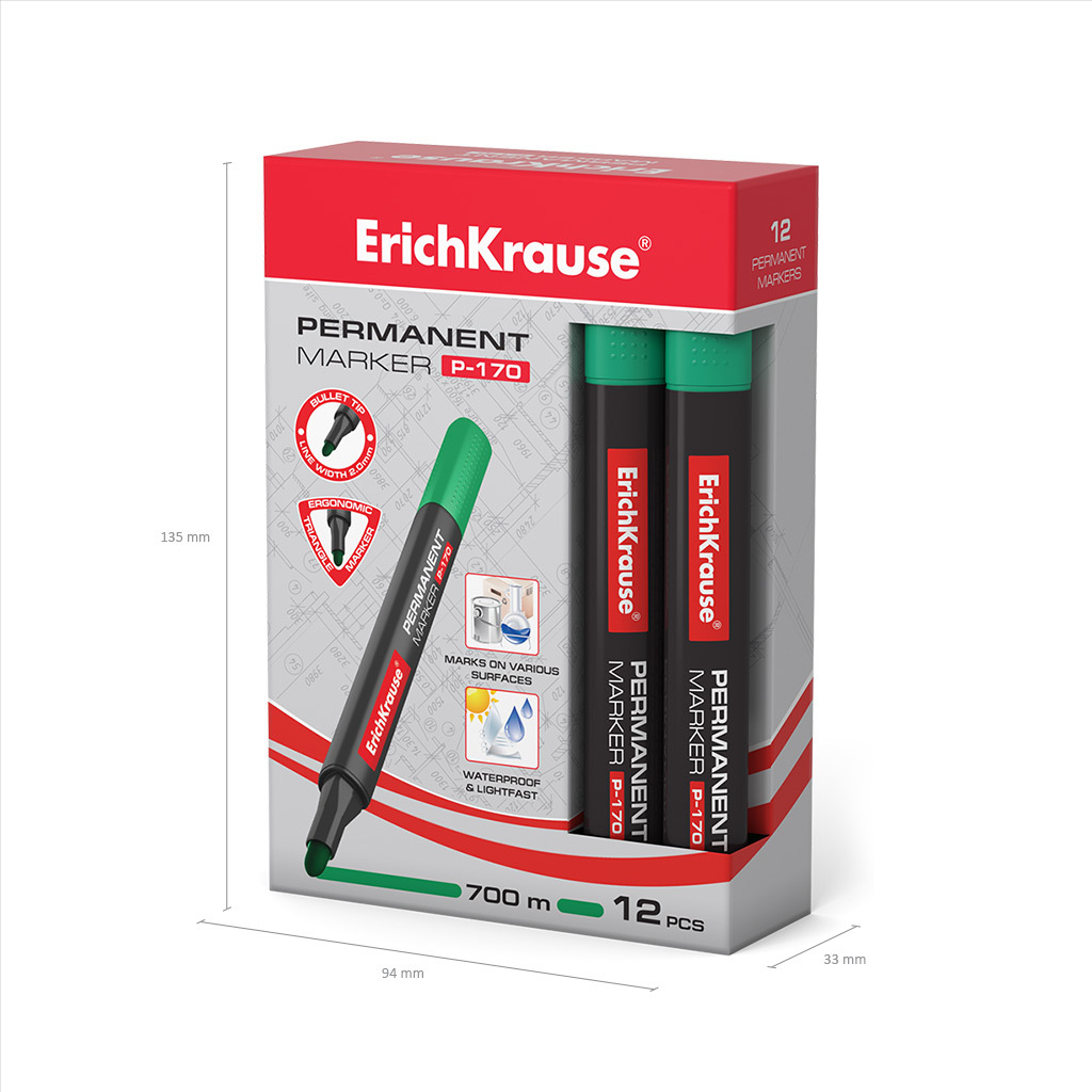 Перманентный маркер с наконечником пулевидной формы. Предназначен для письма и маркировки практически на всех поверхностях: бумага, картон, стекло, пластик, фарфор, дерево и др. Имеет эргономичную трехгранную форму корпуса и цветной колпачок. Цвет колпачка соответствует цвету чернил. Наконечник устойчив к повреждению и истиранию.Толщина письма - 2.0 мм. Чернила на спиртовой основе, водостойкие, светостойкие, устойчивые к ультрафиолетовым лучам, быстро высыхают после нанесения. Не токсичны. Не содержат ксилол, толуол. Срок годности 5 лет.