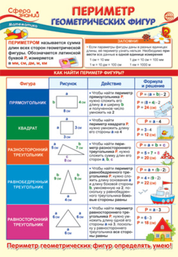 измерения, при помощи формул научит находить периметр прямоугольника, квадрата и трех