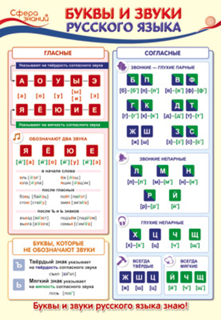 Плакат имеет удобный формат А3, каждое правило оснащено своим текстовым блоком и выделено отдельным цветом для лучшего запоминания. Материал дает представление о гласных и согласных буквах и звуках. Школьники узнают, какие гласные буквы обозначают два звука, какие из гласных указывают на твердость согласного звука, а какие — на мягкость, а какие буквы вообще не обозначают звуков. Согласные даны по глухости-звонкости, твердости-мягкости, выделены всегда твердые и всегда мягкие.