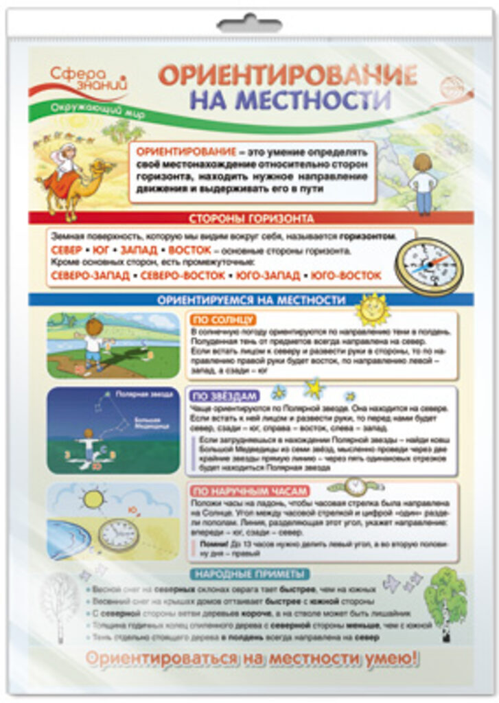 Плакат познакомит учащихся с понятиями «горизонт», «стороны горизонта», научит ориентироваться в сложных условиях по солнцу, звездам, наручным часам, расскажет о народных приметах, помогающих не заблудиться в незнакомой местности.