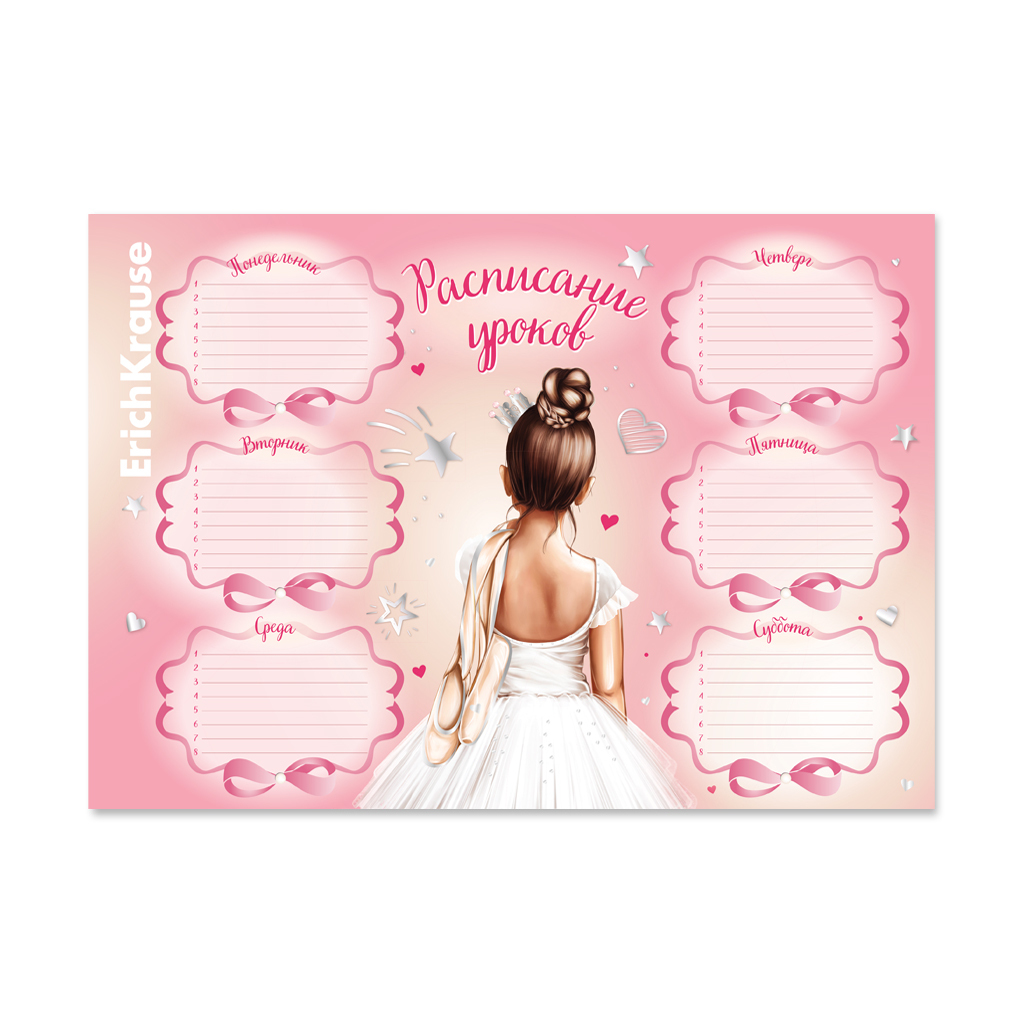 Расписание уроков формата А4 (210х297 мм). Плотный мелованный картон 170 г/м2. Шестидневная учебная неделя. Каждый день содержит 8 строк для записи. Расписания уроков упакованы в термоусадочную пленку по 100 штук.