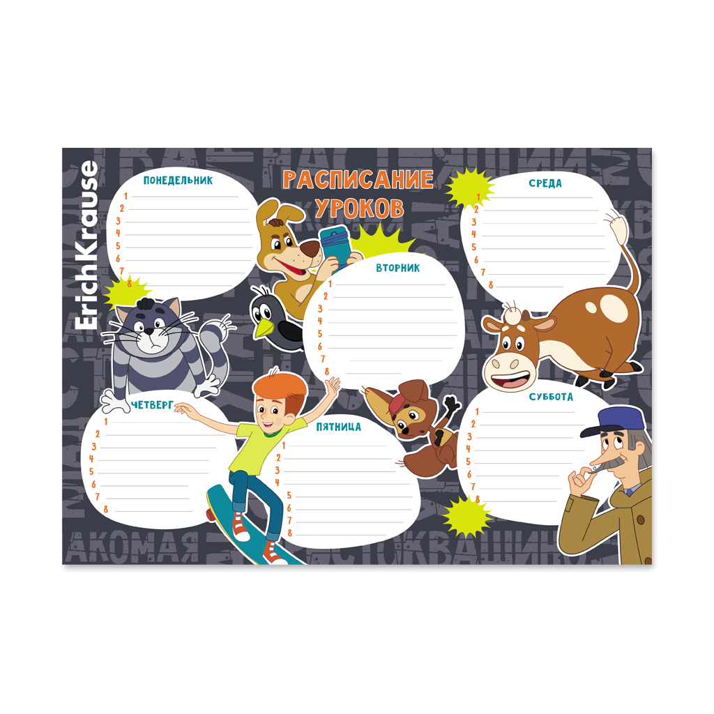 Расписание уроков формата А4 (210х297 мм). Плотный мелованный картон 170 г/м2. Шестидневная учебная неделя. Каждый день содержит 8 строк для записи. Расписания уроков упакованы в термоусадочную пленку по 100 штук.