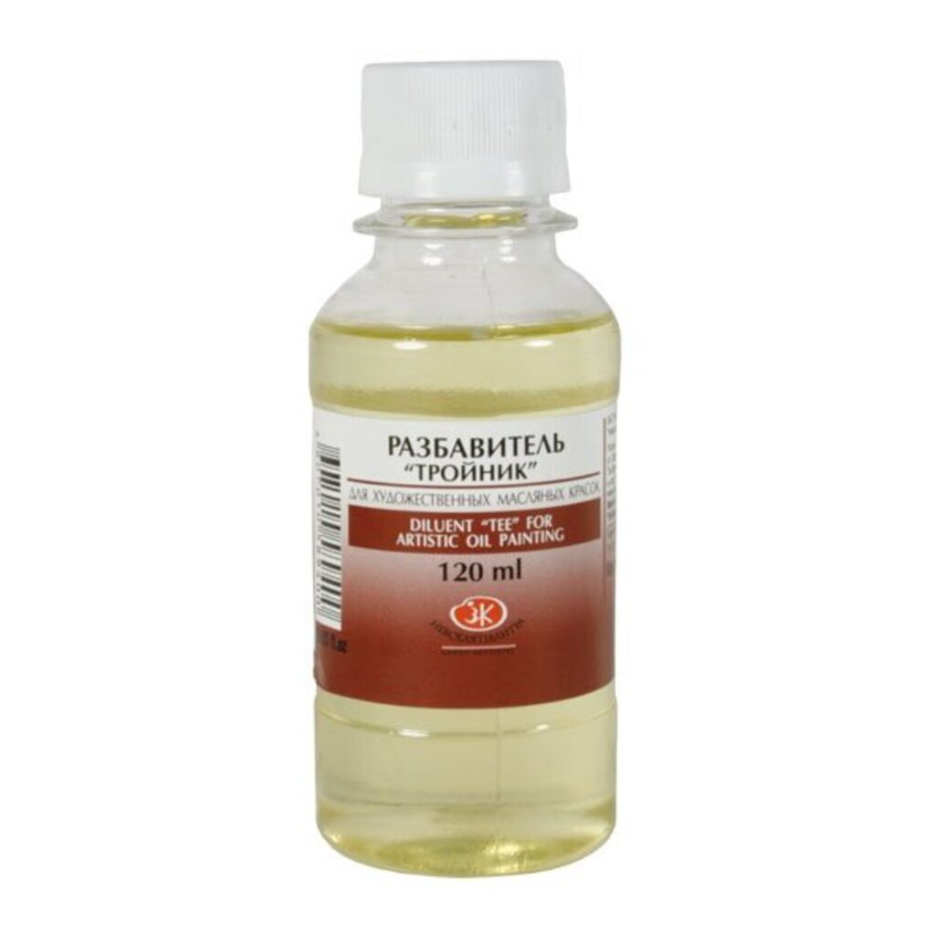 Разбавитель для масляных красок Объем: 120 мл. Разбавитель №3 "тройник" для масляных красок производства завода художественых красок "Невская палитра " (г. Санкт-Петербург) применяется для разведения масляных красок и в качестве промежуточного слоя для усиления адгезии красочных слоёв. Состоит из трех компонентов: смеси даммарного, льняного масла и пинена, поэтому его и принято называть "тройник". Полностью натуральный продукт.