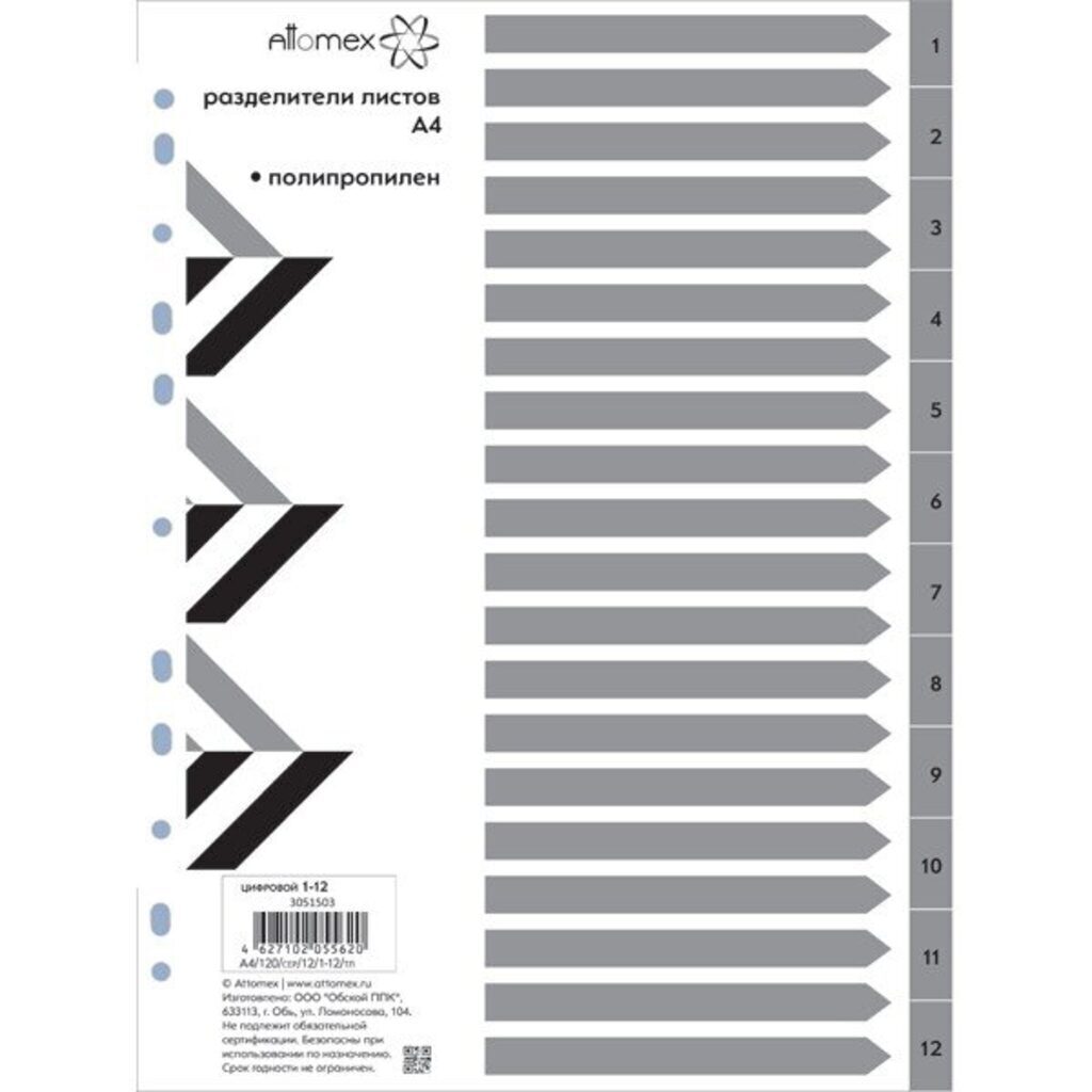 Разделитель листов "Attomex" пластиковый А4 цифровой цифры 1-12. Обеспечивает сохранность листов. Для подшивки бумаг в архивные папки без перфорирования дыроколом. Стандартная перфорация совместима с любыми видами архивных папок.