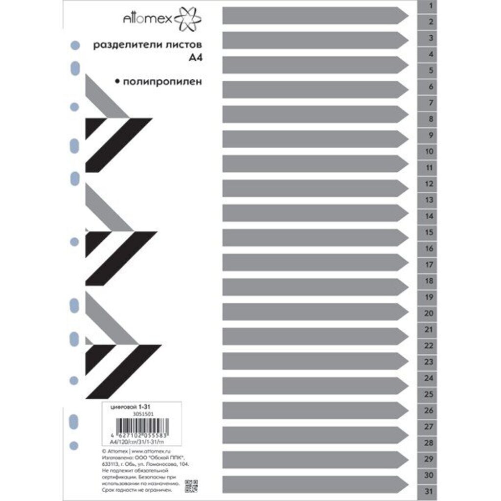 Разделитель листов "Attomex" пластиковый А4 цифровой цифры 1-31. Обеспечивает сохранность листов. Для подшивки бумаг в архивные папки без перфорирования дыроколом. Стандартная перфорация совместима с любыми видами архивных папок.