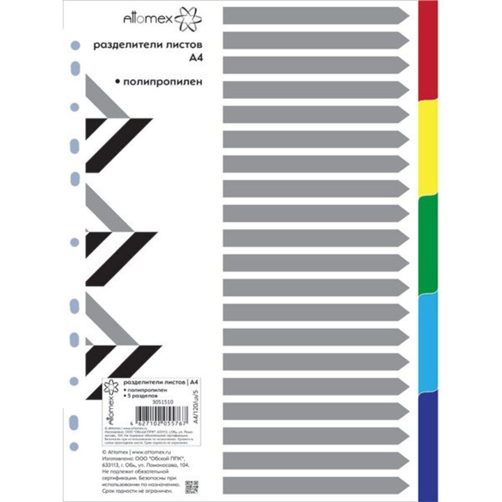 Разделитель листов "Attomex" пластиковый А4. Обеспечивает сохранность листов. Для подшивки бумаг в архивные папки без перфорирования дыроколом. Стандартная перфорация совместима с любыми видами архивных папок. Разделитель листов "Attomex" пластиковый A4 цветовой 5 цветов