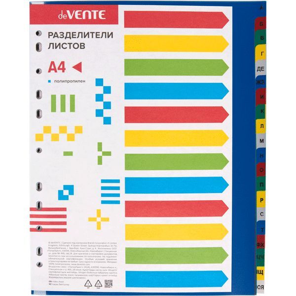 Формат: A4+ Материал: полипропилен Плотность листа: 140 мкм Маркировка листов: русский алфавит Количество листов: 20 Количество цветов: 5 Описание: усиленная перфорация