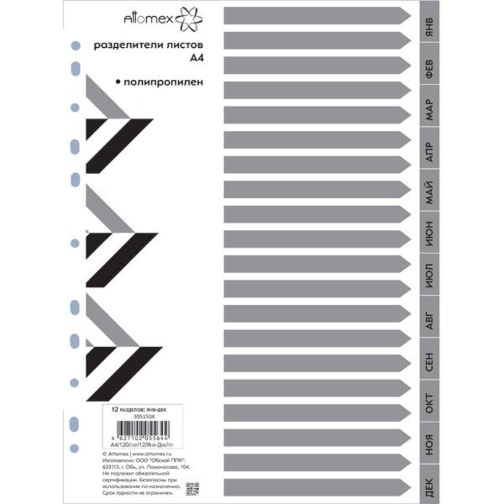 Разделитель листов "Attomex" пластиковый А4 по месяцам Янв-Дек. Обеспечивает сохранность листов. Для подшивки бумаг в архивные папки без перфорирования дыроколом. Стандартная перфорация совместима с любыми видами архивных папок.