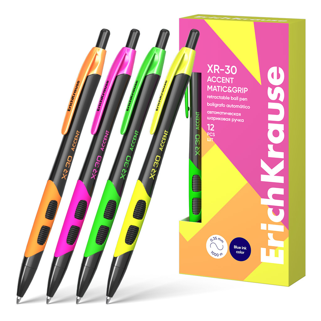 Автоматическая шариковая ручка Matic&Grip со стандартным типом пишущего узла и заменяемым стержнем. Ручка имеет круглый непрозрачный корпус с эргономичной комбинированной грип-зоной из резины и профилированного пластика. 5-канальный пишущий узел с диаметром шарика 0.7 мм в сочетании с быстросохнущими чернилами обеспечивает мягкое и быстрое письмо. Длина непрерывной линии составляет 1000 м при толщине 0.35 мм, что является высоким показателем в своей категории. Модель XR-30 Matic&Grip Accent 0.7 продолжает модельный ряд XR-30 бестселлеров в ассортименте автоматических ручек ErichKrause в новой коллекции.