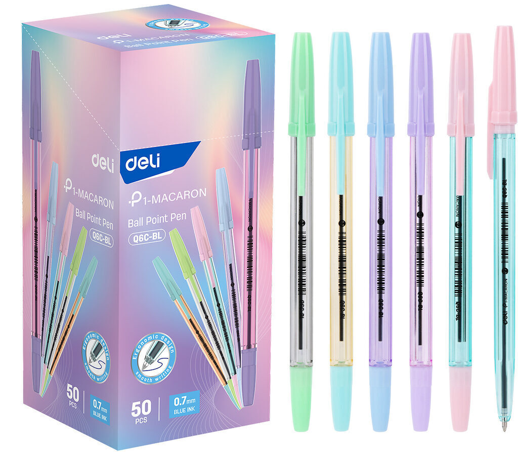 Ручка шариков. Deli P1-Macaron EQ6C-BL корп.ассорти/прозрачный d=0.7мм чернила син.