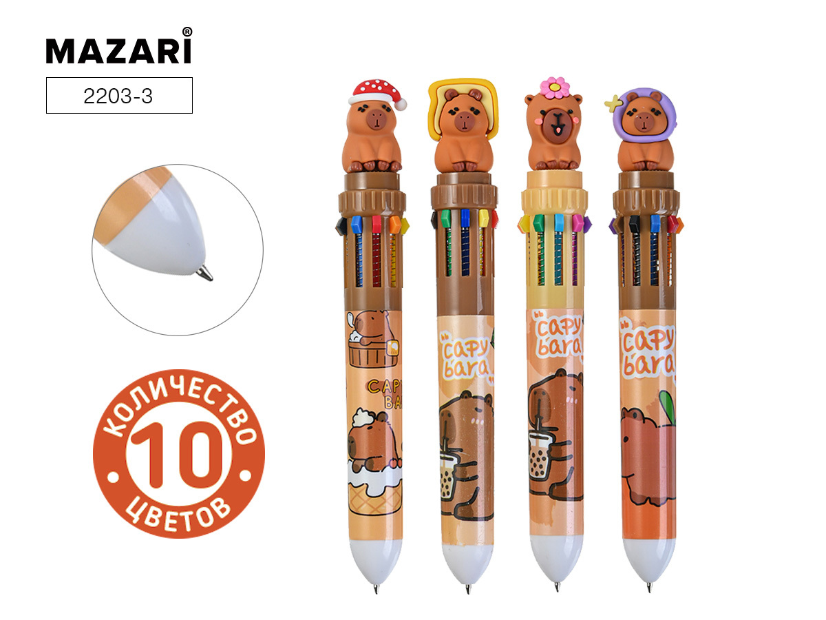 Автоматическая шариковая ручка удобна в использовании, экономит место в пенале или на рабочем столе, позволяет всегда иметь под рукой набор основных цветов для письма и выделения записей. Пластиковый круглый корпус дополнен фигуркой каапибары. Модель содержит 10 цветов с оптимальной толщиной пишущего узла 0,7 мм. Автоматический нажимной механизм, обеспечивает плавную подачу необходимого стержня. Разноцветные чернила оптимальной консистенции равномерно распределяются при письме, мгновенно высыхая и не размазываясь. Дизайн в ассортименте.
