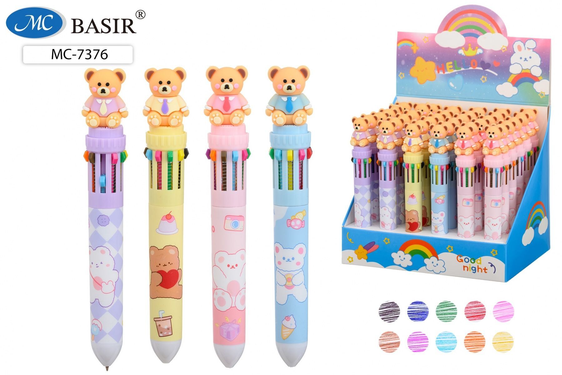 Ручка от бренда "Basir". Эта популярная у детей ручка имеет в своем корпусе 10 цветных стержней, которые автоматически выдвигаются, если нажать на рычажок нужного цвета. Толщина пишущего узла у стержней составляет 0,6 мм.