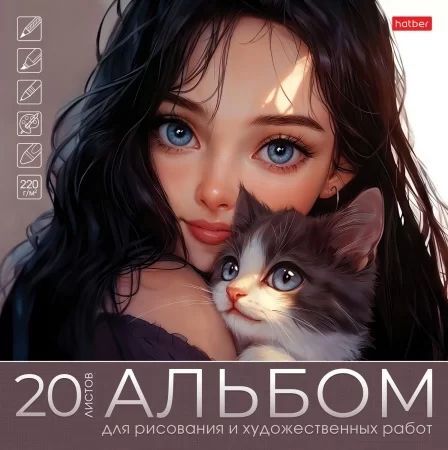 Скетчбук 220*220мм 20л., клеевой кор., 220гр/м2 "Cat and girl" жестк.подл., мат.лам., тисн.
