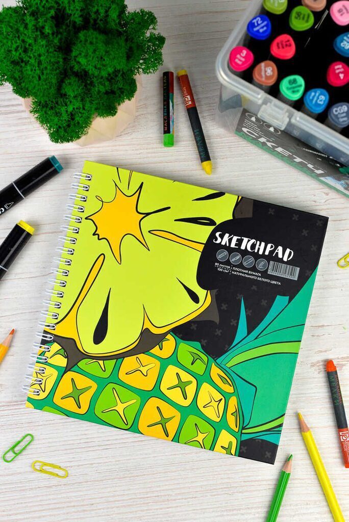 Скетчпад. ТРОПИЧЕСКИЕ ФРУКТЫ. Размер 195х195 мм. Количество листов - 80 л. Тип обложки: твёрдый переплёт на гребне. Цвет внутреннего блока - белый офсет. Плотность бумаги 100 г/м?. Обложка: полноцветная печать. Ламинация обложки - матовая ламинация. Особенности: перевёртыш.