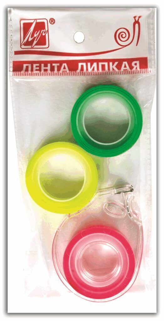 Лента липкая разработана для канцелярских нужд. Применяется для склеивания поврежденных документов, скрепления страниц, расклейки объявлений, защиты надписей, изготовления этикеток, для упаковки подарков, коробок, пакетов и прочего.В комплекте - три ролика ленты ярких флуоресцентных цветов и диспенсер, Каждая единица товара выпускается с индивидуальным штрих-кодом.